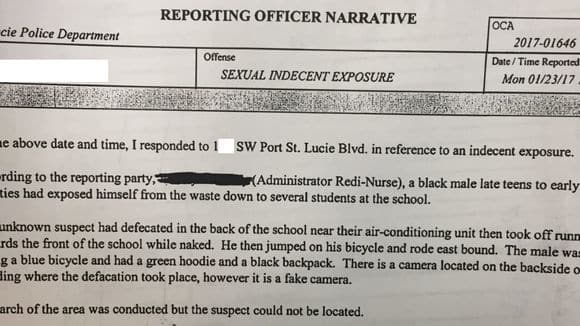 The accused nether regions exposer “defecated in the back of the school near their air-conditioning unit then took off running towards the front of the school while naked,” the report states.